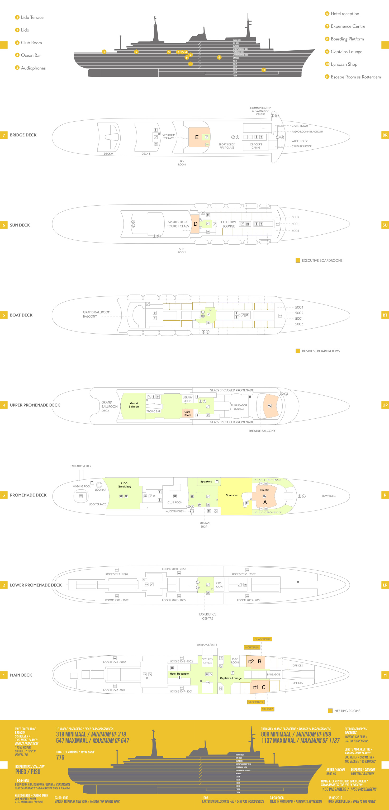 The ss Rotterdam has many decks, and we use quite a few of them. The Overview is below.